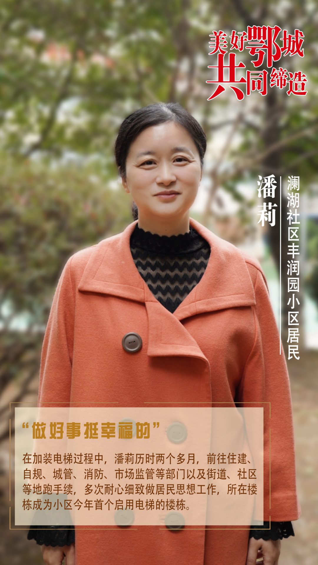 在加装电梯过程中,潘莉历时两个多月,前往住建、自规、城管、消防、市场监管等部门以及街道、社区等地跑手续,多次耐心细致做居民思想工作,所在楼栋成为小区今年首个启用电梯的楼栋。