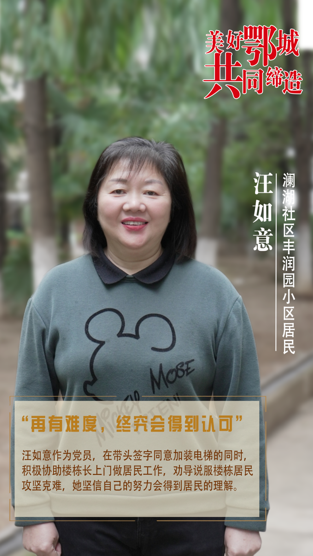 汪如意作为党员,在带头签字同意加装电梯的同时,积极协助楼栋长上门做居民工作,劝导说服楼栋居民攻坚克难,她坚信自己的努力会得到居民的理解。