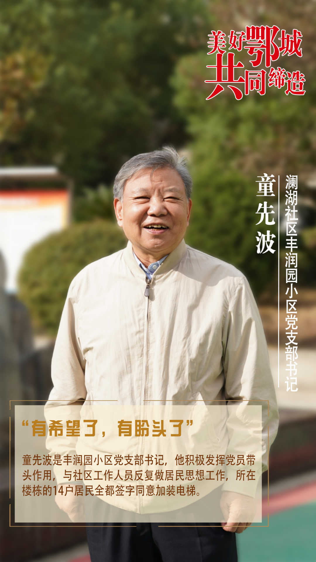 童先波是丰润园小区党支部书记,他积极发挥党员带头作用,与社区工作人员反复做居民思想工作,所在楼栋的14户居民全都签字同意加装电梯。