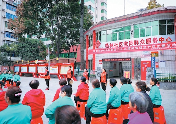 11月22日下午,在茅箭区五堰街道燕林社区新时代文明实践站,“俏大姐”宣讲队通过自编自演的三句半《党的二十大指航程》等文艺节目,向居民宣讲党的二十大精神。“俏大姐”宣讲队由平均年龄60岁以上的文艺爱好者组成,利用三句半等文艺表现形式,将党的最新理论成果以通俗易懂、百姓喜闻乐见的方式传递到基层。记者 闵波 摄