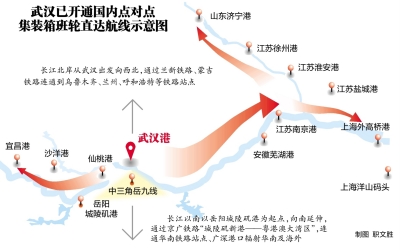 武汉开通至岳阳城陵矶港集装箱航线后,武汉港开通的国内点对点集装箱班轮直达航线达到13条。