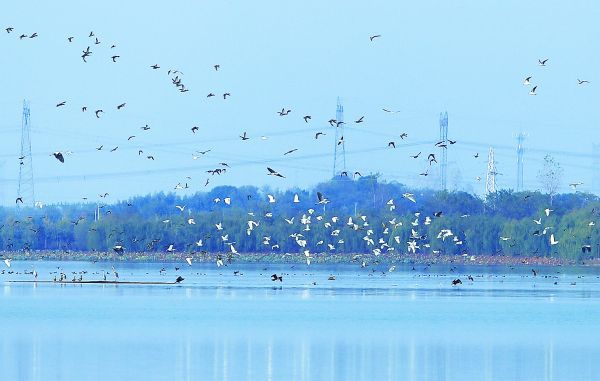 近日,笔者在百里长湖沙洋县毛李镇、后港镇段不时可以看到难以计数的鹭鸟、野鸭、红嘴鸥等鸟儿在湖面湿地觅食、飞翔,场面壮观。近年来,随着长湖拆围、禁渔等工作措施的推进,来这里栖息繁衍的鸟儿逐渐增多。(陈国强 摄)