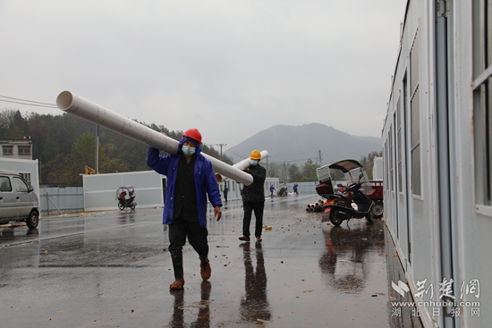 “雨又来了,管道这边加人、加料,大家加把劲,今天必须完成所有排污管道的铺设。”11月29日上午6时,崇阳县赤通公路旁备用集中隔离点项目建设现场,跟雨点一样急的是项目A区负责人刘华豪沙哑的嘶吼。