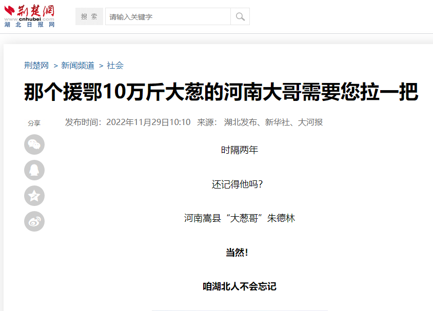 11月29日中午,湖北大道物流集团有限公司董事长梅海涛电话联系上了河南嵩县闫庄镇竹园沟村党支部书记朱德林,在电话中,梅海涛向他询问了当地大葱滞销情况,承诺购买2万斤大葱。当听到“大葱哥”说当地物流不方便,梅海涛表示将从武汉调度一辆大货车去当地运回来。