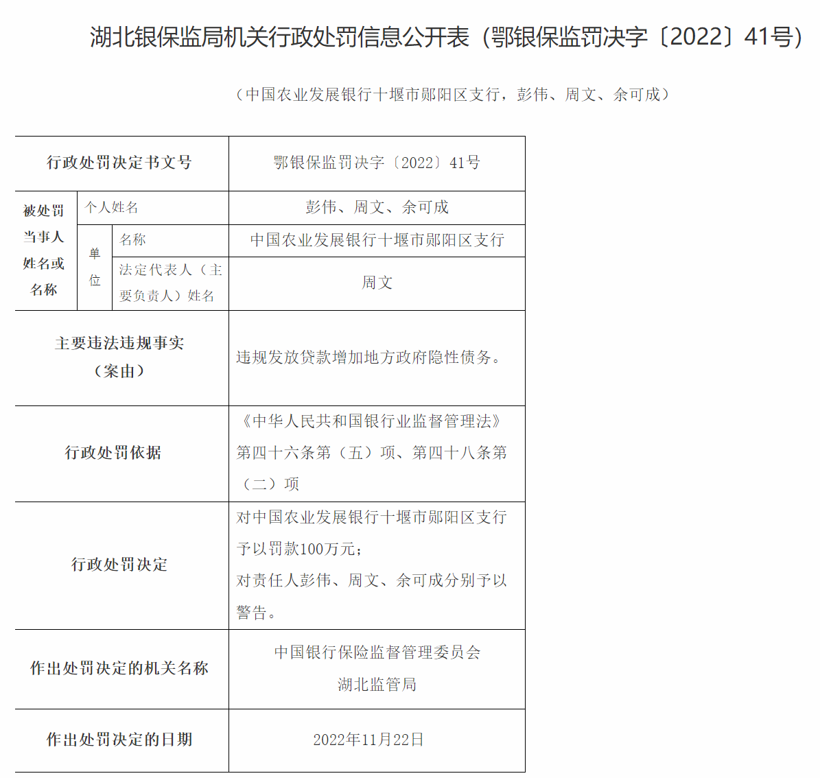 罚单显示,中国农业发展银行十堰市郧阳区支行主要违法违规事实(案由)为违规发放贷款增加地方政府隐性债务,责任人为彭伟、周文、余可成。
