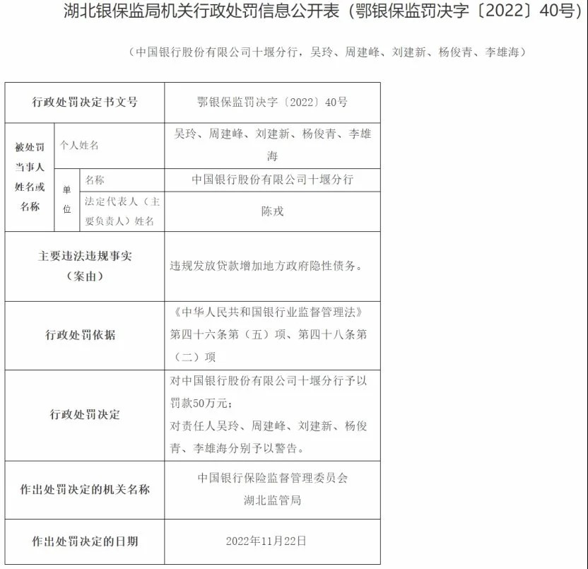 中国银保监会网站近日公布的湖北银保监局机关行政处罚信息公开表(鄂银保监罚决字〔2022〕40号)显示,中国银行(601988)股份有限公司十堰分行存在违规发放贷款增加地方政府隐性债务的违法违规事实。