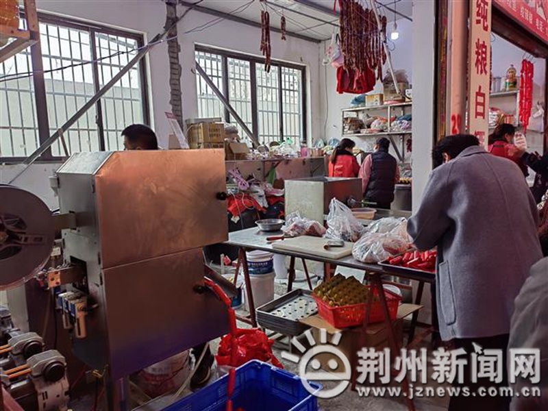 来到沙市区廖子河农贸市场,最热闹的地方就是灌香肠的门店,大家不是提着肉在排队,就是等着取自己的香肠,商户则忙着碎肉、调味、灌肠。