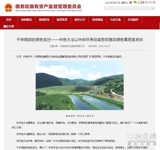 荆楚网(湖北日报网)讯(通讯员 王刚 陶三保)12月1日,从中色大冶获悉,在中央环保督察通报公司典型案例一周年之际,反映中色大冶环保督察整改、绿色发展成效的通讯《千年铜都的绿色变迁》在国资委网站、中国有色金属报等多家主流媒体和行业媒体上刊发。