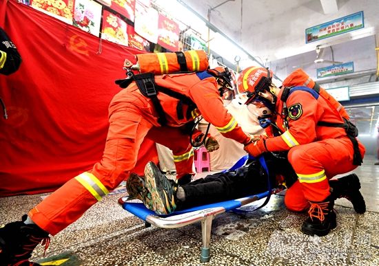 此次演练模拟上窑新安综合批发市场A区一门面因使用取暖器引燃窗帘而引发火灾,火势迅速蔓延,形成大面积火灾,火势封闭疏散通道,有2人被困。