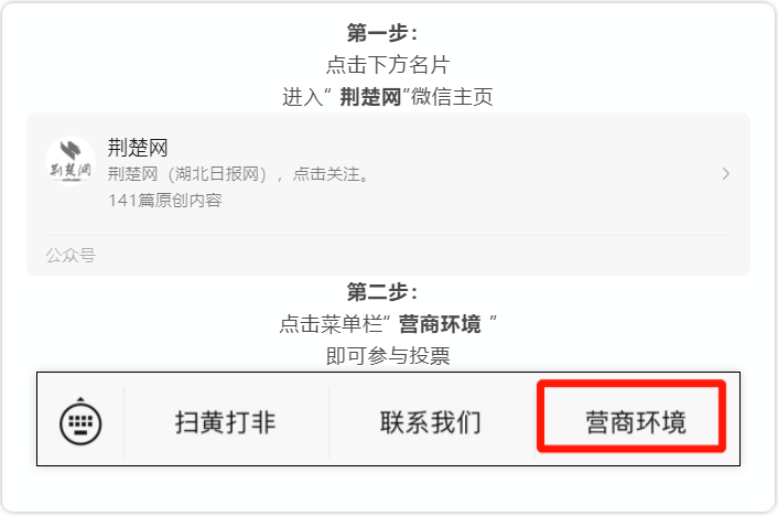 1.进入“荆楚网”公众号进行投票。广大网友可为您支持的湖北省优化营商环境先行区改革候选案例进行投票,每人每天可投票1次,选择的候选案例不超过10个,投票不超过10票。