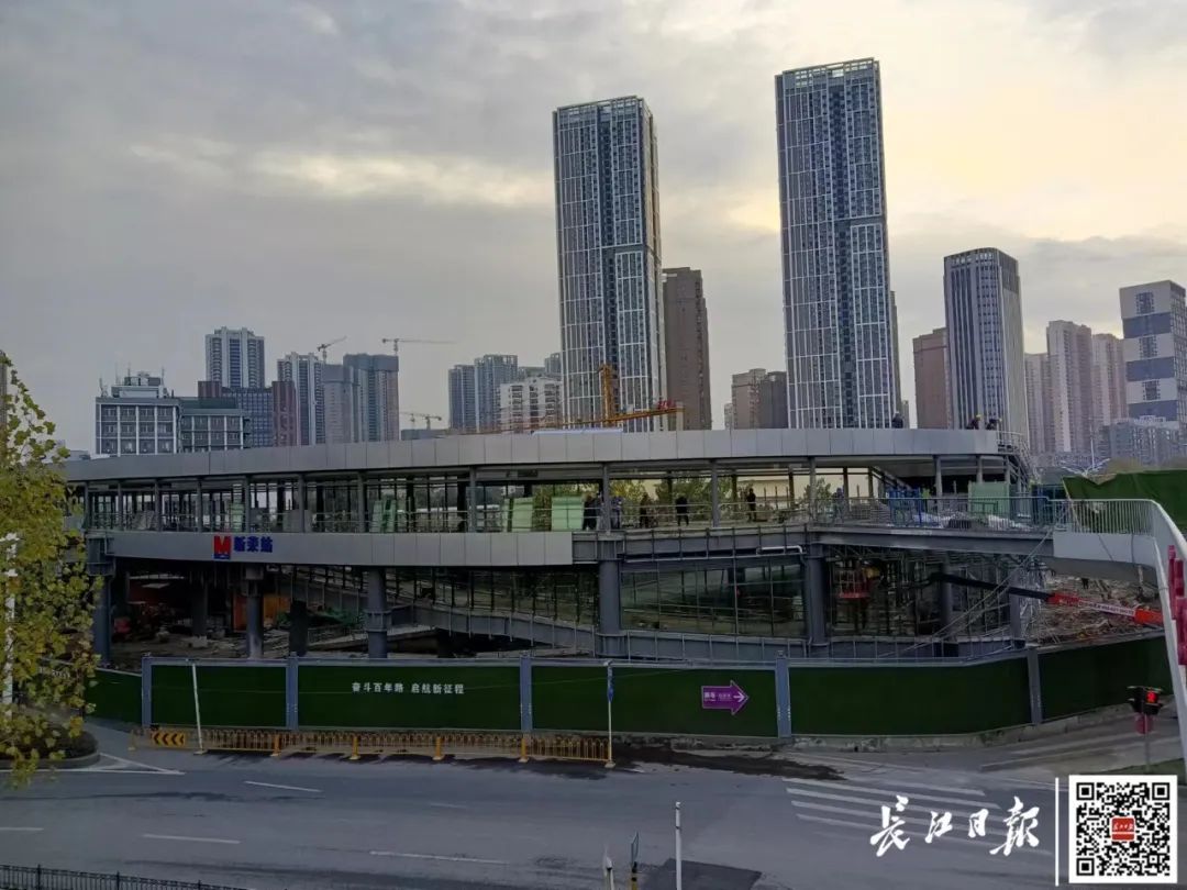 12月2日,长江日报记者来到武汉新荣换乘通道项目工地,发现圆弧形的换乘天桥已经建成;在换乘天桥中段,“新荣站”3个蓝色大字挂在天桥外侧。施工方一名工作人员表示,新荣换乘通道已进入装修施工阶段,目前工人们正在加紧施工,争取项目按计划进度完成。