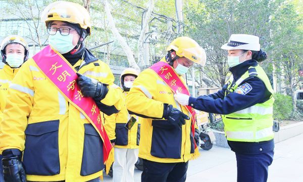 12月2日是全国第十一个交通安全日,市交警支队联合美团外卖公司通过外卖送餐员佩戴“文明守法 平安回家”绶带的形式,宣传文明守法出行。(记者 郑波 通讯员 谈媛媛 摄)