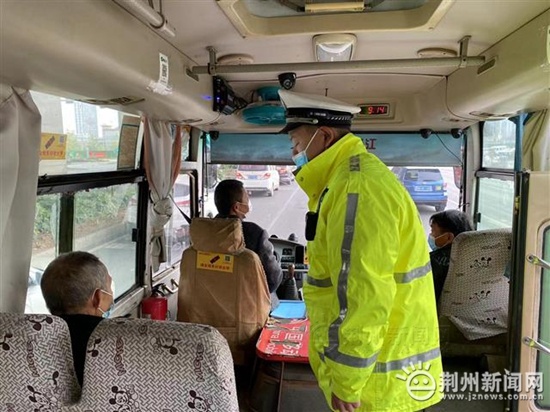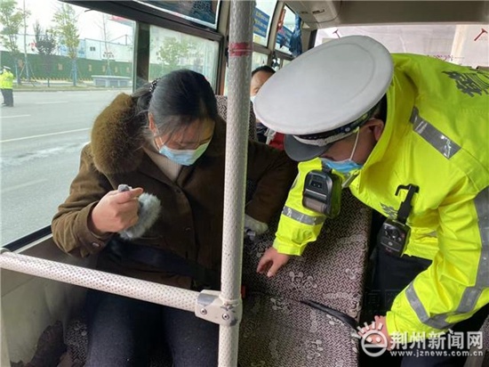 上午9点,荆州市公安局交管局一大队三中队民警在小北门开展冬季交通安全整治大会战交通秩序整治行动,一辆客运车辆驶入检查区域,民警随即上车检查。有乘客没有系好安全带,民警予以提醒,同时也反复跟驾驶员强调。