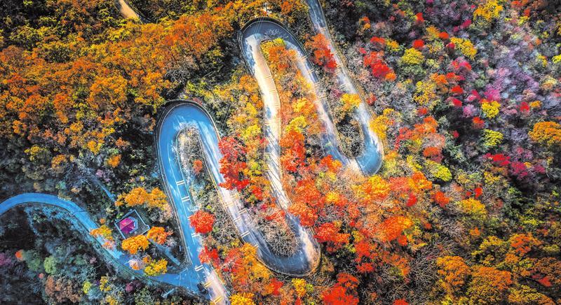 通往大洪山风景名胜区核心景区的道路两边,火红的枫叶与蜿蜒曲折的盘山路完美结合,美如画卷。 (随州日报全媒记者李文军、通讯员韩起璞摄)