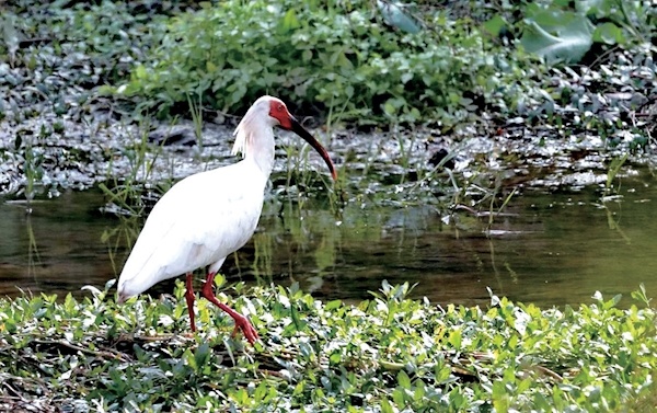 这只朱鹮时而在清澈河水觅食,时而飞进附近茂密的水草里歇息。
