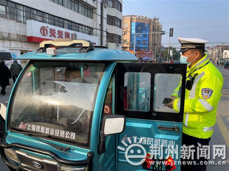 当天上午9点半,荆州市公安局交管局一大队三中队民警联合荆州区公安分局菱角湖派出所民警在菱角管理区道路上开展交通违法行为整治行动,没一会儿,一辆三轮车驾驶员违法载人被民警拦截。
