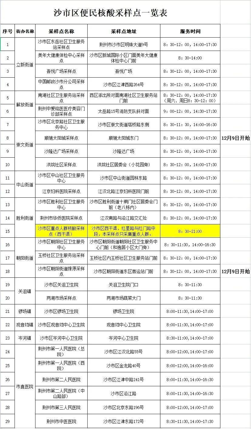 为深入贯彻落实党中央、国务院决策部署,落实十条优化措施。区指挥部决定自12月8日开始将沙市区核酸采样点优化调整为29处,现将采样点进行公示(见附表)。