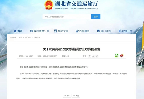 刚刚,湖北省交通运输厅发布关于武黄高速公路收费期满停止收费的通告。