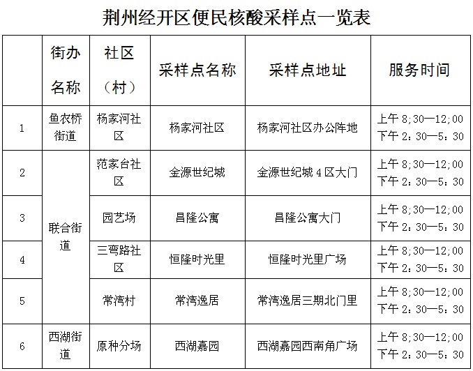 为深入贯彻落实党中央、国务院决策部署,落实十条优化措施。区指挥部决定自12月8日开始将荆州经开区核酸采样点优化调整为6处,现将采样点进行公示(见附表)。