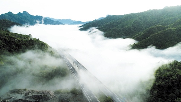 十(堰)房(县)高速穿越官山河上游的云雾。(2019年4月29日摄)