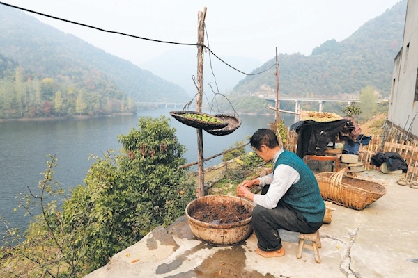 官山水库岸边打理中草药的村民。(2022年11月9日摄)