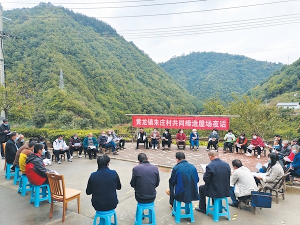 张湾区黄龙镇朱庄村召开场院会,引导村民对村级事务共商共谋。