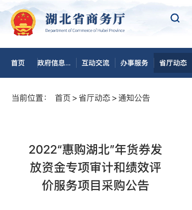 公告显示,根据湖北省政府采购有关管理规定,湖北省商务厅拟公开选择第三方承办机构,承办2022“惠购湖北”年货券发放资金专项审计和绩效评价工作。