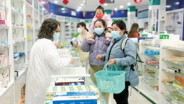 12月10日,市民正在国药商场选购药品。据了解,我市药店消炎、止咳、感冒等类型的药品销售正常,市民可根据情况适量购买,没有必要囤积药品。(记者 郑波 摄)
