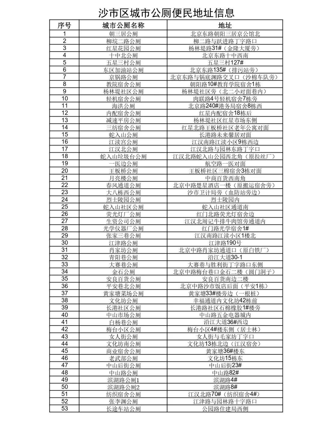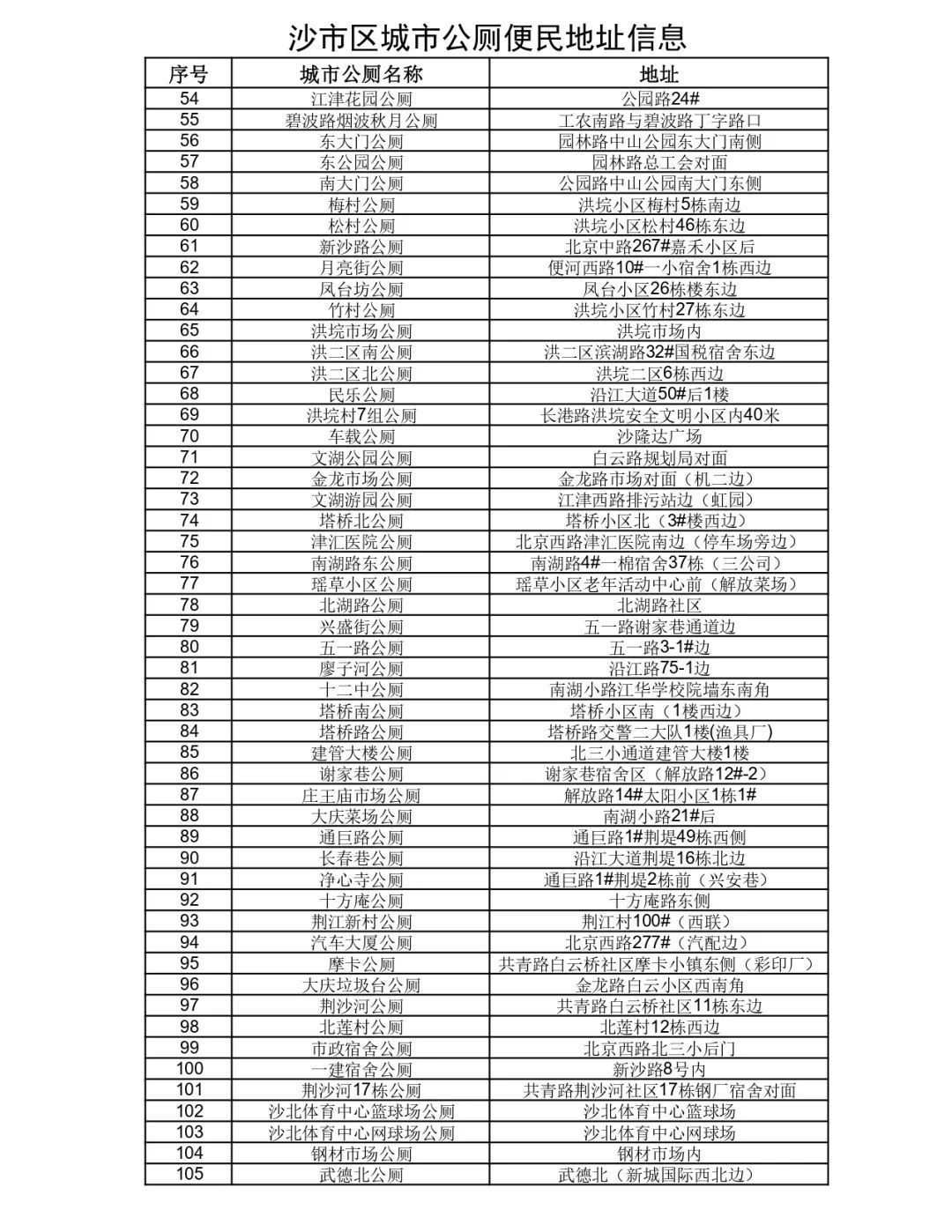 沙市区主次干道、社区现投入使用的公共厕所105座地址如下: