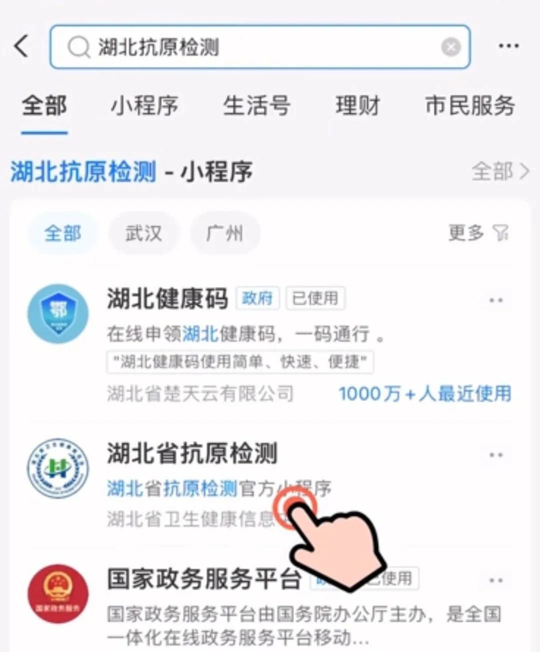 1.首先打开支付宝,搜索“湖北抗原检测”,点击“湖北省抗原检测官方小程序”,进入“个人检测上报”。
