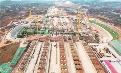 12月13日,荆门西站施工作业区多台大型塔吊正在吊装材料,砼运输车、泵车正在浇筑砼,400余名建设者有序忙碌……现场一派火热景象。据中铁建工荆门西站项目党支部书记李瑞东介绍,荆门西站站房工程自今年9月18日完成钢构件首吊后,项目全面进入主体施工阶段,目前项目站房、站台基础工程基本完成,C区已进入地下出站层顶板施工、北侧站台雨棚结构也已施工,所有主体结构建设正加速推进。荆门西站距荆门城区9公里,是沿江高铁、荆荆高铁、襄荆高铁并站的一座大型高铁枢纽站,站房面积近4万平方米。(记者 张彩云 摄)