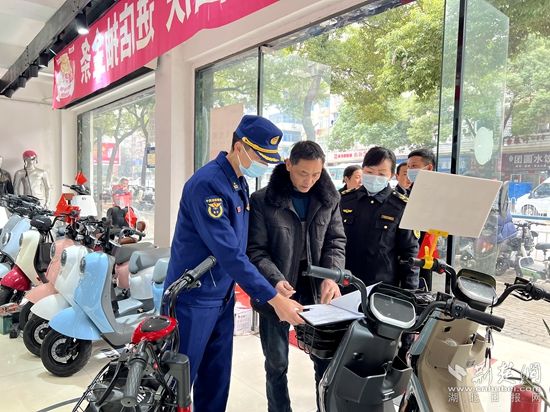 荆楚网(湖北日报网)讯(通讯员卢雅婕)为加强电动自行车销售领域安全管理,12月7日,黄石市黄石港区消防救援大队联合市场监督管理局对电动自行车经营场所安全隐患开展专项排查整治。