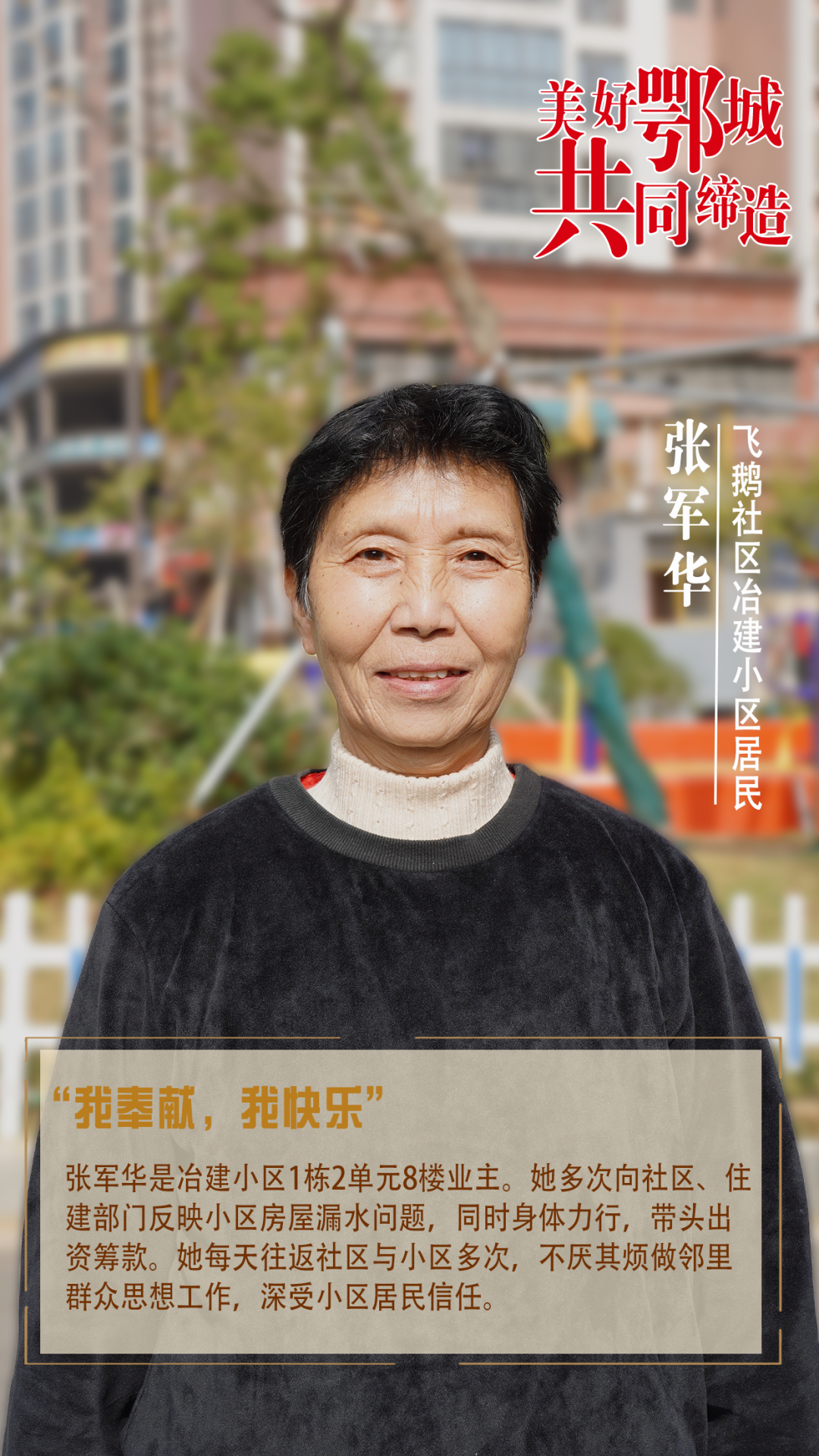 张军华是冶建小区1栋2单元8楼业主。她多次向社区、住建部门反映小区房屋漏水问题,同时身体力行,带头出资筹款。她每天往返社区与小区多次,不厌其烦做邻里群众思想工作,深受小区居民信任。