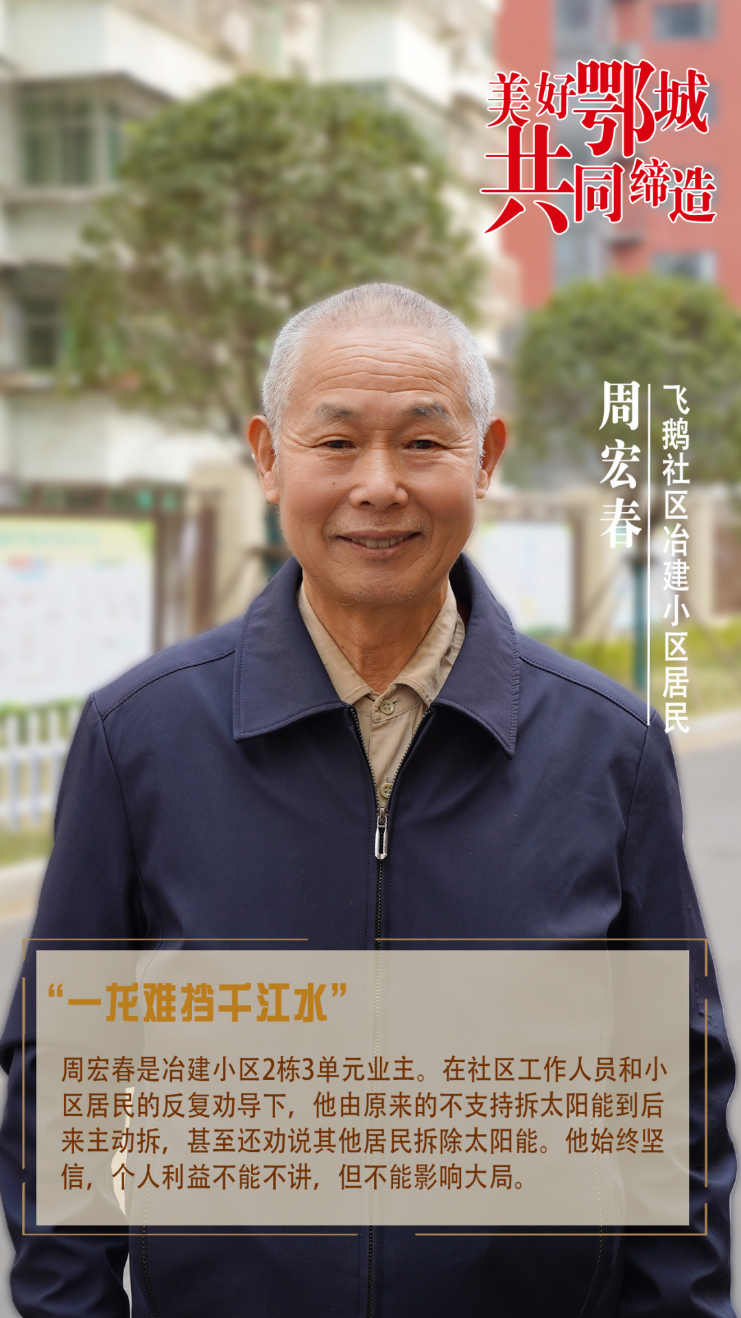 周宏春是冶建小区2栋3单元业主。在社区工作人员和小区居民的反复劝导下,他由原来的不支持拆太阳能到后来主动拆,甚至还劝说其他居民拆除太阳能。他始终坚信,个人利益不能不讲,但不能影响大局。