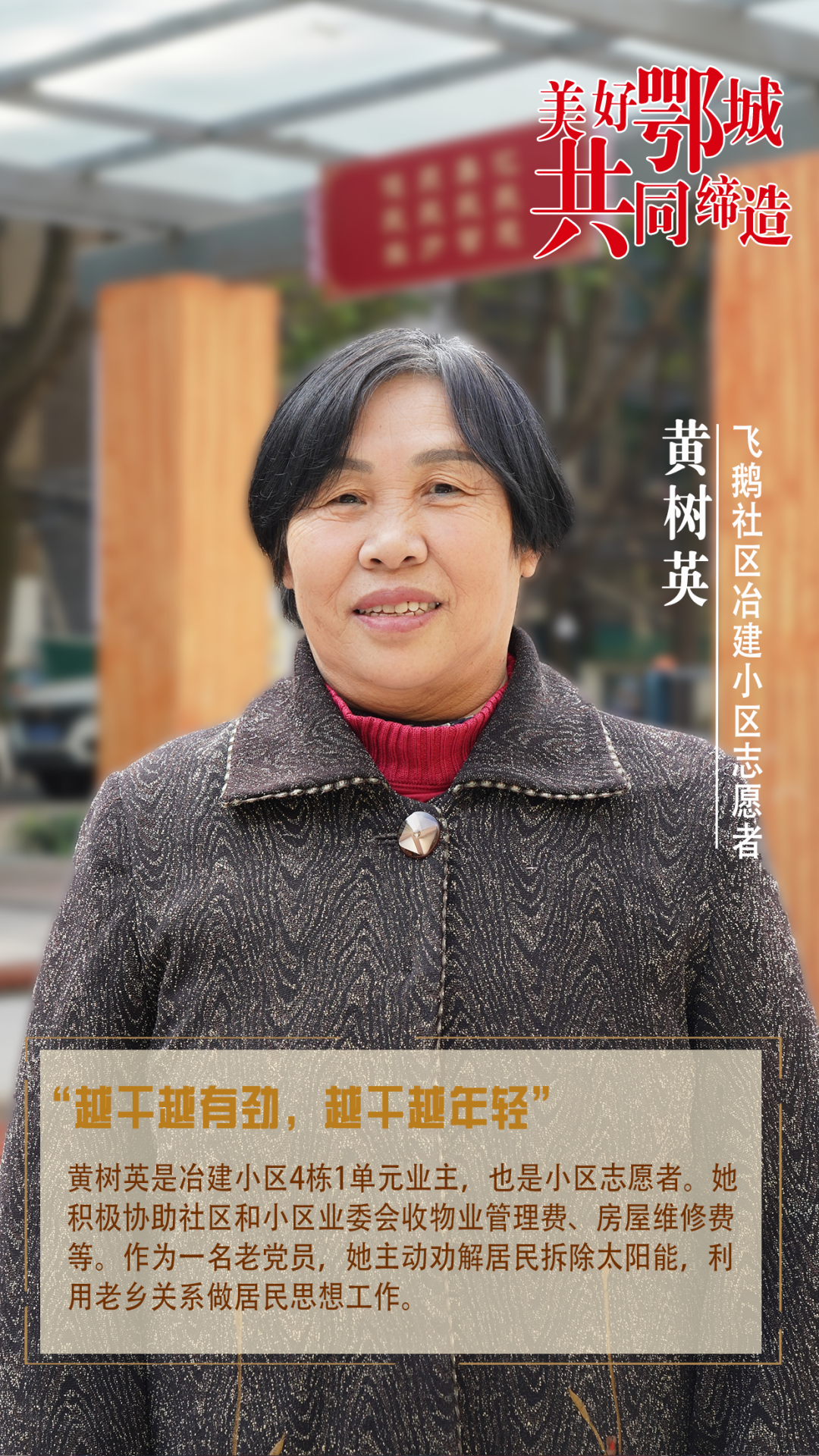 黄树英是冶建小区4栋1单元业主,也是小区志愿者。她积极协助社区和小区业委会收物业管理费、房屋维修费等。作为一名老党员,她主动劝解居民拆除太阳能,利用老乡关系做居民思想工作。