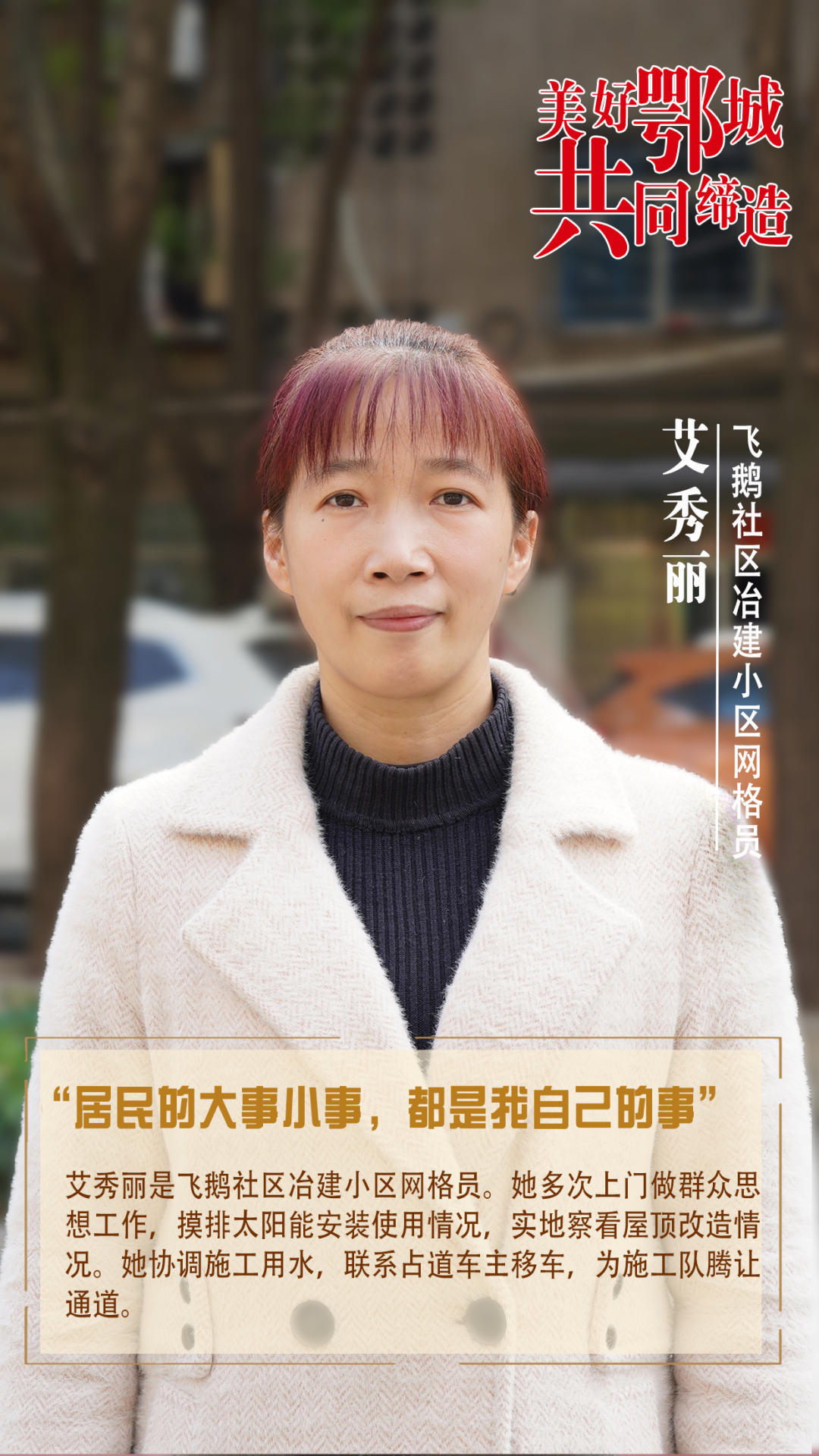 艾秀丽是飞鹅社区冶建小区网格员。她多次上门做群众思想工作,摸排太阳能安装使用情况,实地察看屋顶改造情况。她协调施工用水,联系占道车主移车,为施工队腾让通道。