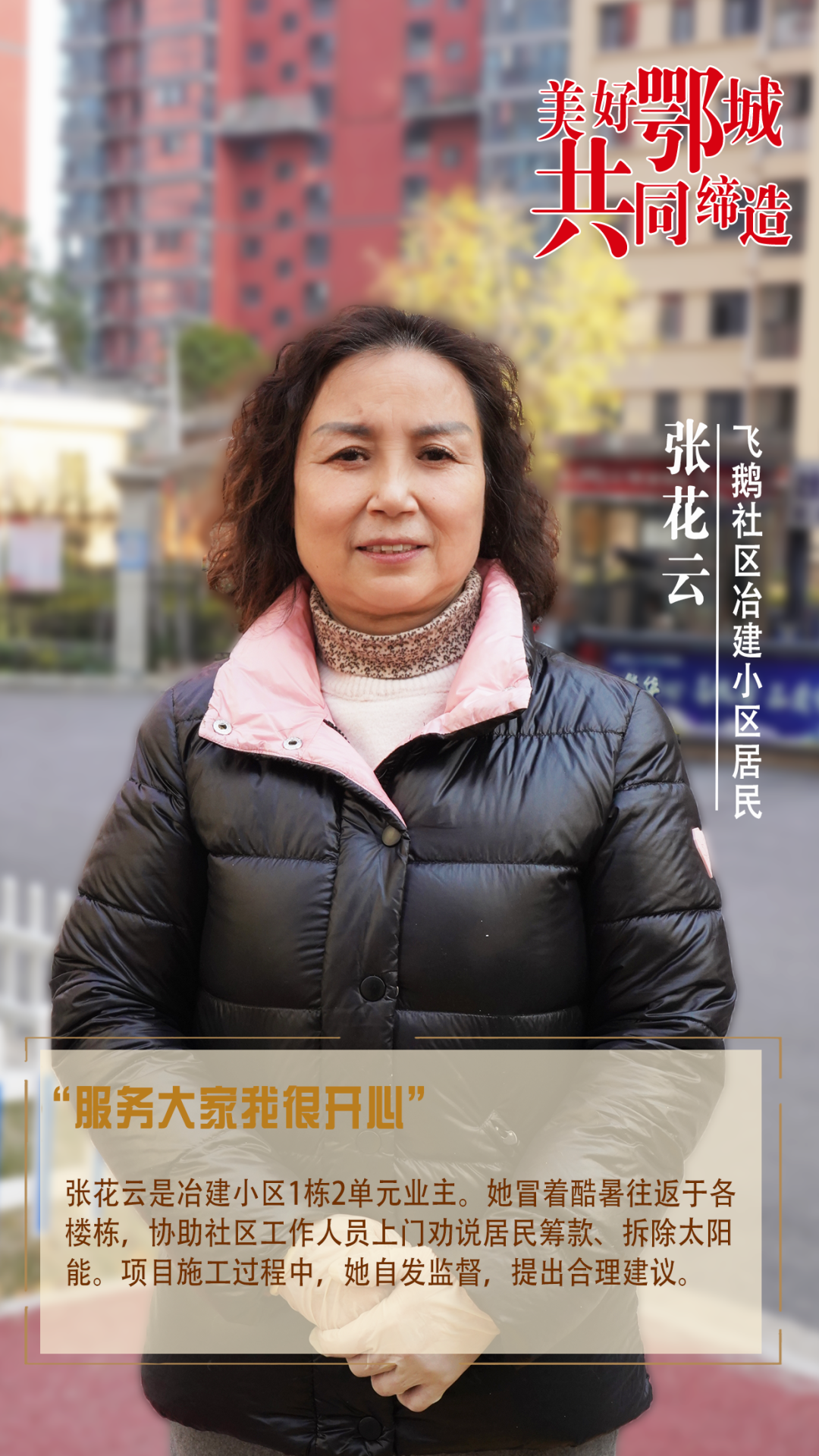 张花云是冶建小区1栋2单元业主。她冒着酷暑往返于各楼栋,协助社区工作人员上门劝说居民筹款、拆除太阳能。项目施工过程中,她自发监督,提出合理建议。