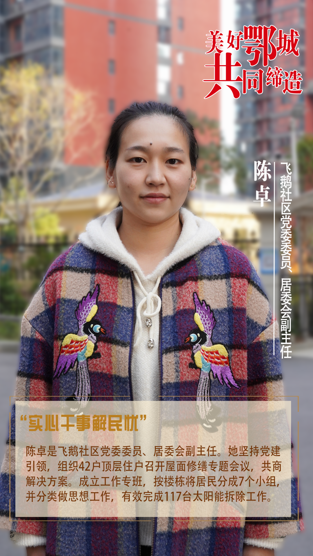 陈卓是飞鹅社区党委委员、居委会副主任。她坚持党建引领,组织42户顶层住户召开屋面修缮专题会议,共商解决方案。成立工作专班,按楼栋将居民分成7个小组,并分类做思想工作,有效完成117台太阳能拆除工作。
