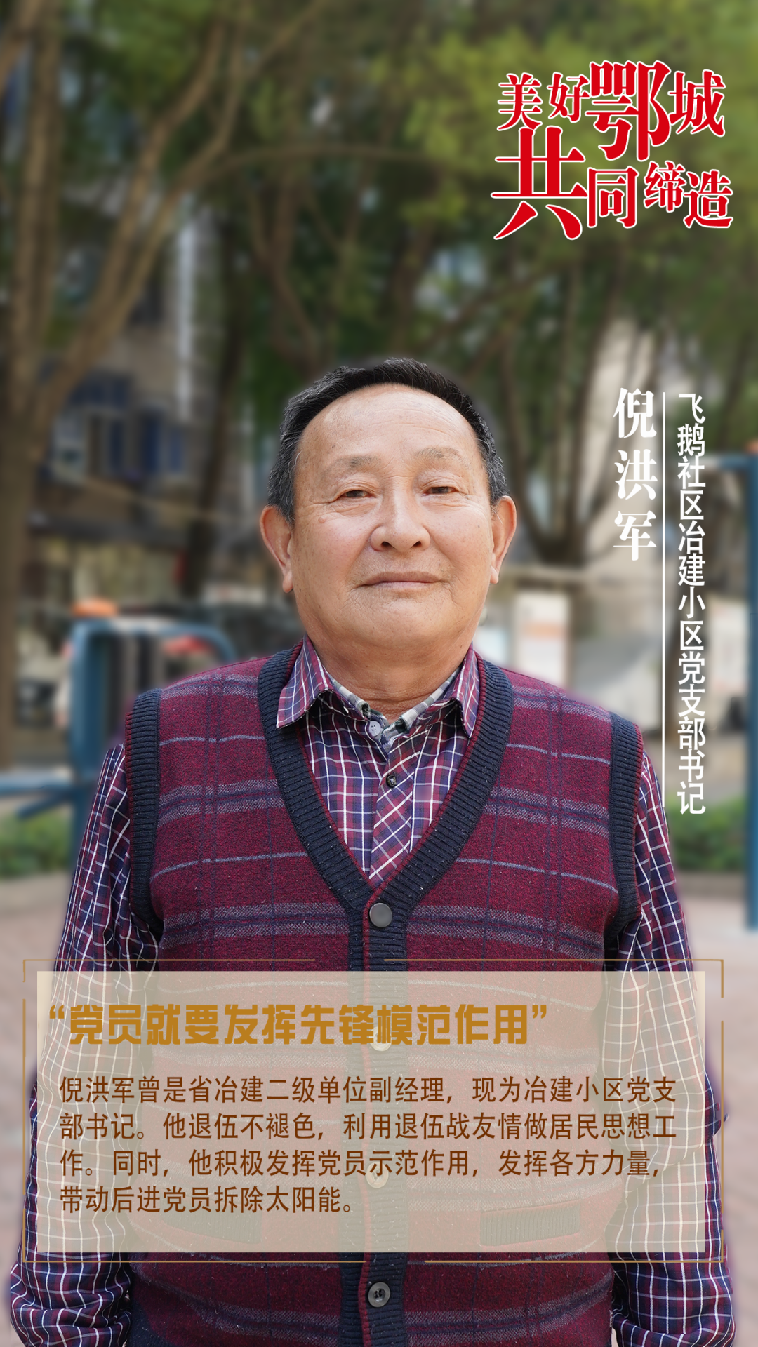 倪洪军曾是省冶建二级单位副经理,现为冶建小区党支部书记。他退伍不褪色,利用退伍战友情做居民思想工作。同时,他积极发挥党员示范作用,发挥各方力量,带动后进党员拆除太阳能。