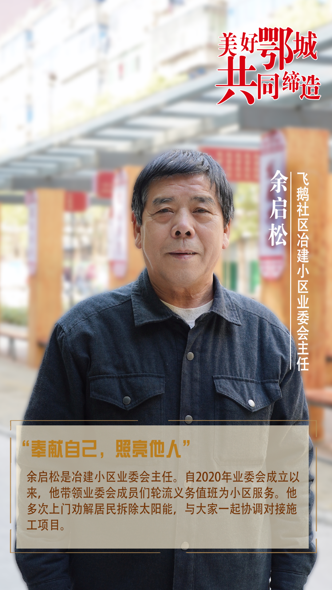 余启松是冶建小区业委会主任。自2020年业委会成立以来,他带领业委会成员们轮流义务值班为小区服务。他多次上门劝解居民拆除太阳能,与大家一起协调对接施工项目。