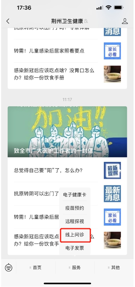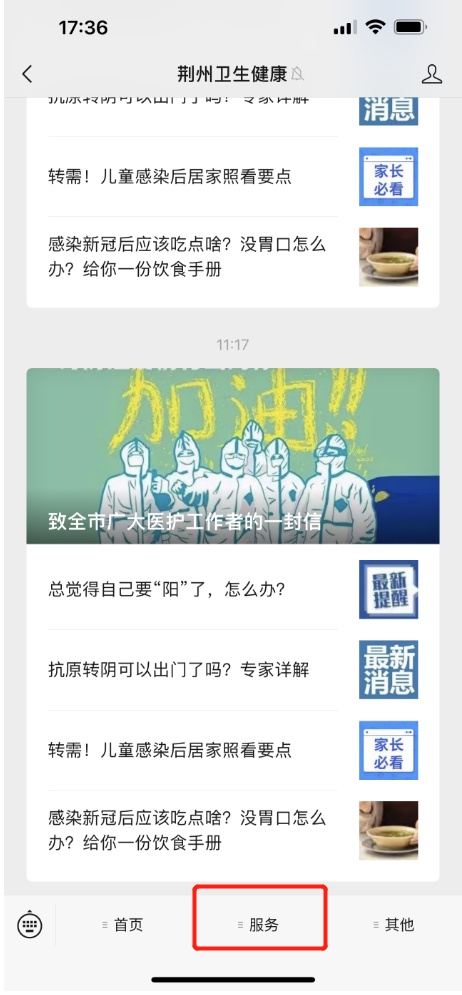 第一步:“荆州卫生健康”对话框点击“服务”