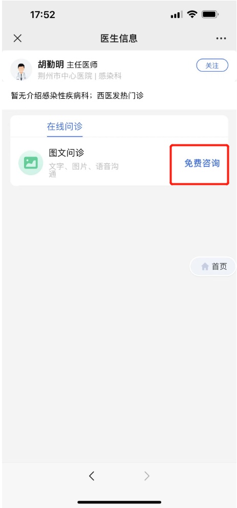 患者只需打开微信,搜索“荆州卫生健康”,进入“荆州卫生健康”对话框,点击主页面“服务”,进入线上问诊服务。目前,平台上有6家市直医疗机构,合计140名医师加入,患者可选择其中任何一家,享受线上的新冠患者居家治疗、健康监测、治疗方式等咨询服务。