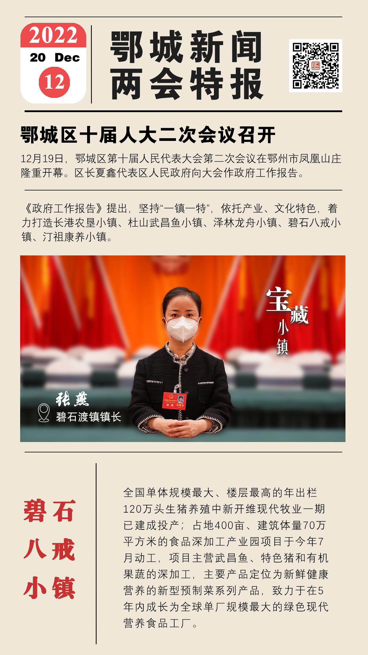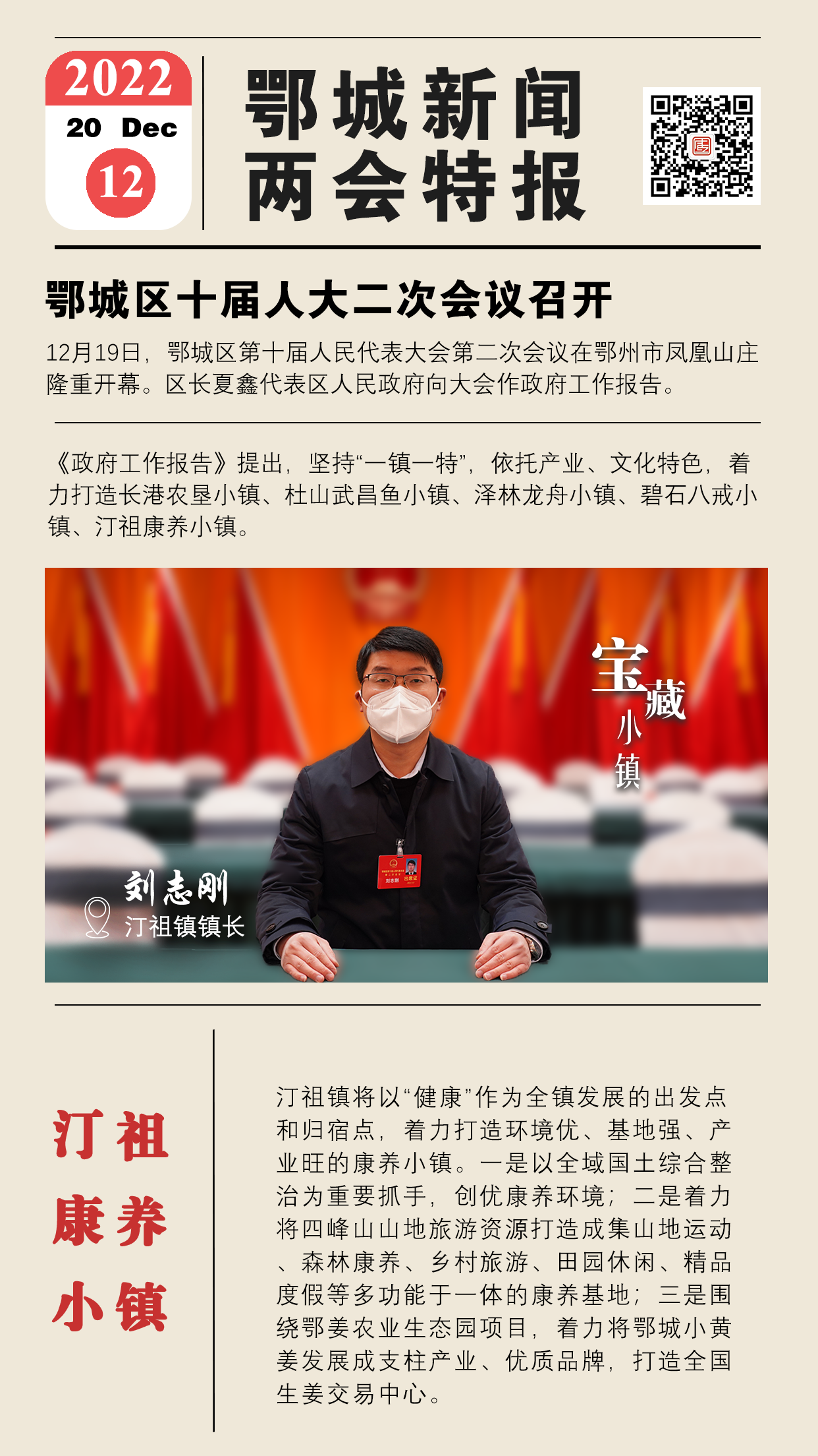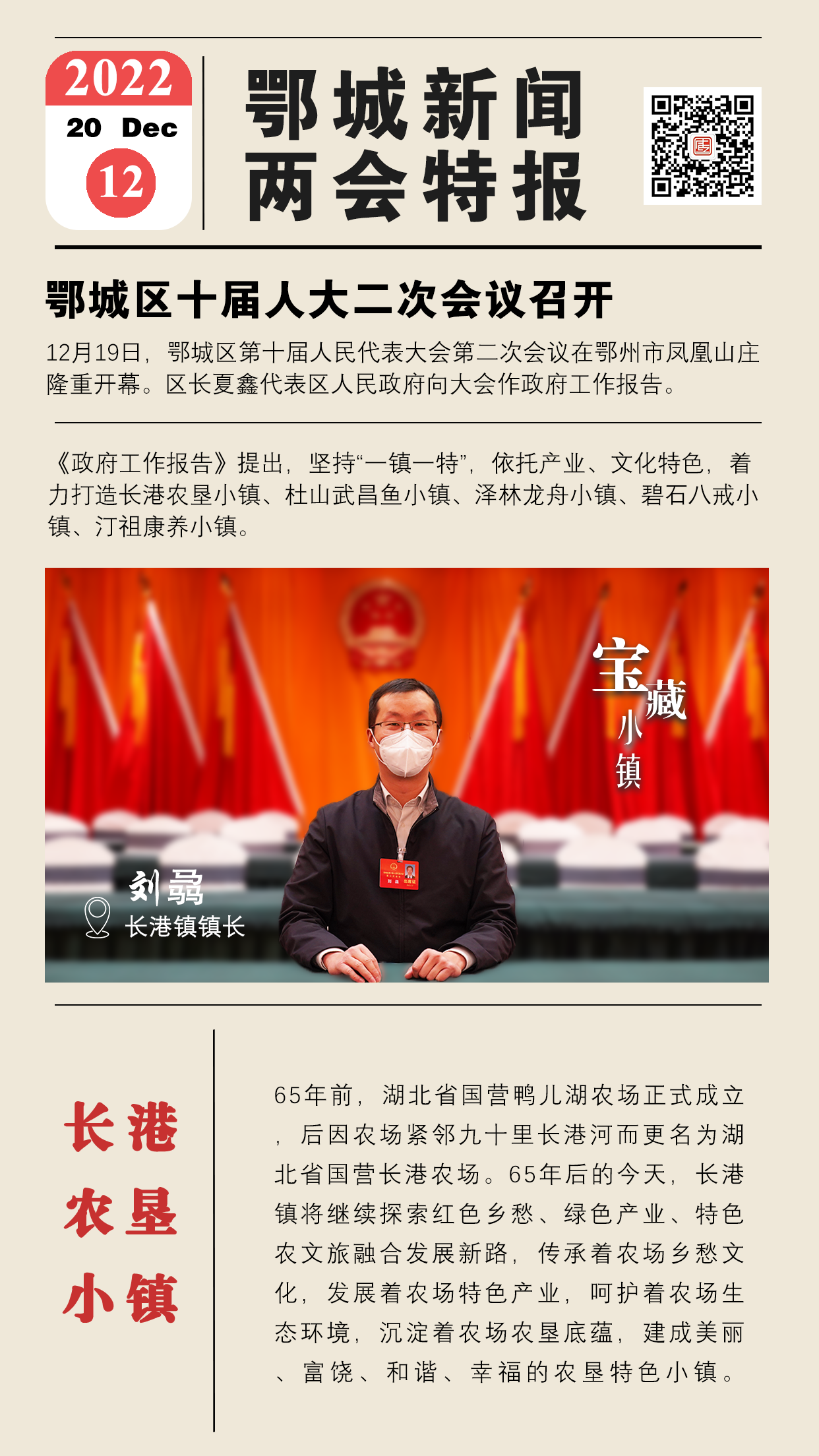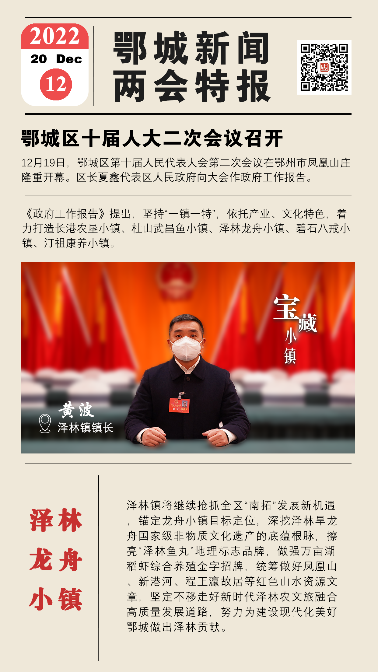鄂城区政府工作报告提出,坚持“一镇一特”,依托产业、文化特色,着力打造长港农垦小镇、杜山武昌鱼小镇、泽林龙舟小镇、碧石八戒小镇、汀祖康养小镇。