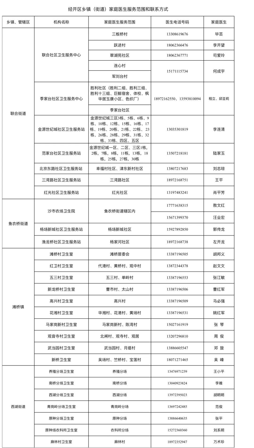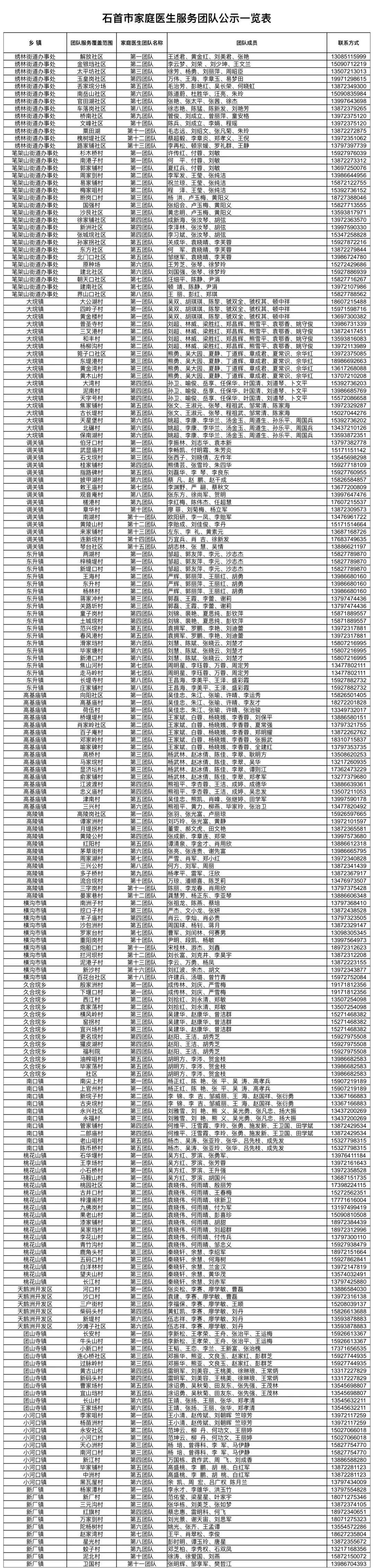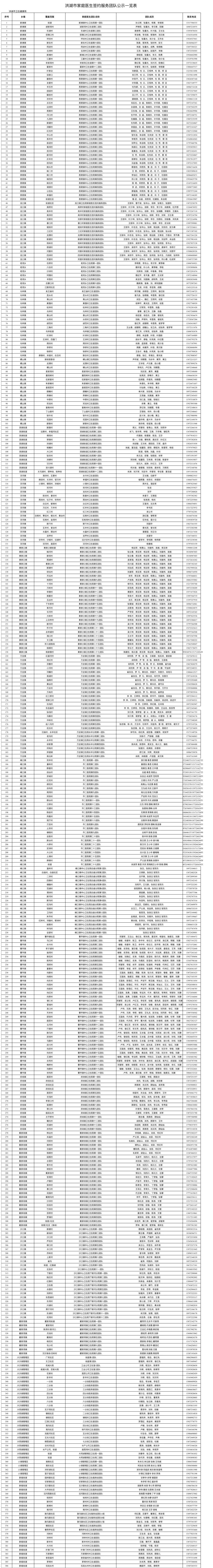 全市家庭医生团队服务范围和联系方式