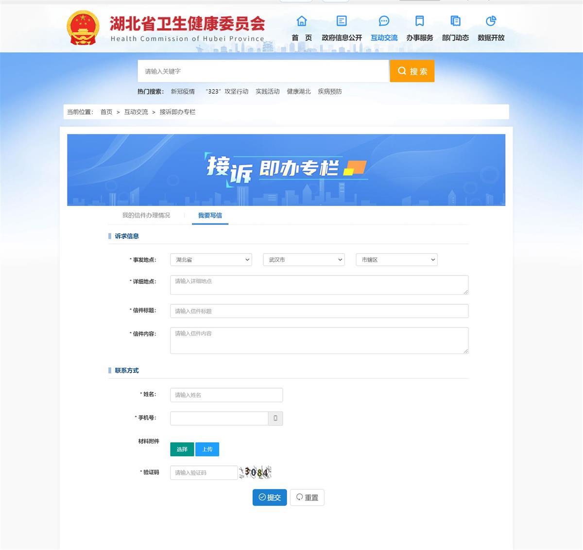 “接诉即办”专栏,可从湖北省人民政府门户网站(www.hubei.gov.cn)和湖北省卫健委网站(wjw.hubei.gov.cn)进入。在湖北省人民政府门户网站首页中部的“政府信息公开”区域左侧,有显著的“接诉即办”专栏入口;在湖北省卫健委官网,入口在首页左下角醒目显示。进入专栏后,新提交诉求,可在“我要写信”区域,按照提示依次填写相关信息,对事发地址、诉求标题和内容进行如实填写,并实名留下诉求人信息及联系方式,如有附件材料,也需一并上传。查询办理进展情况,可输入查询密码、投诉人姓名后获悉。