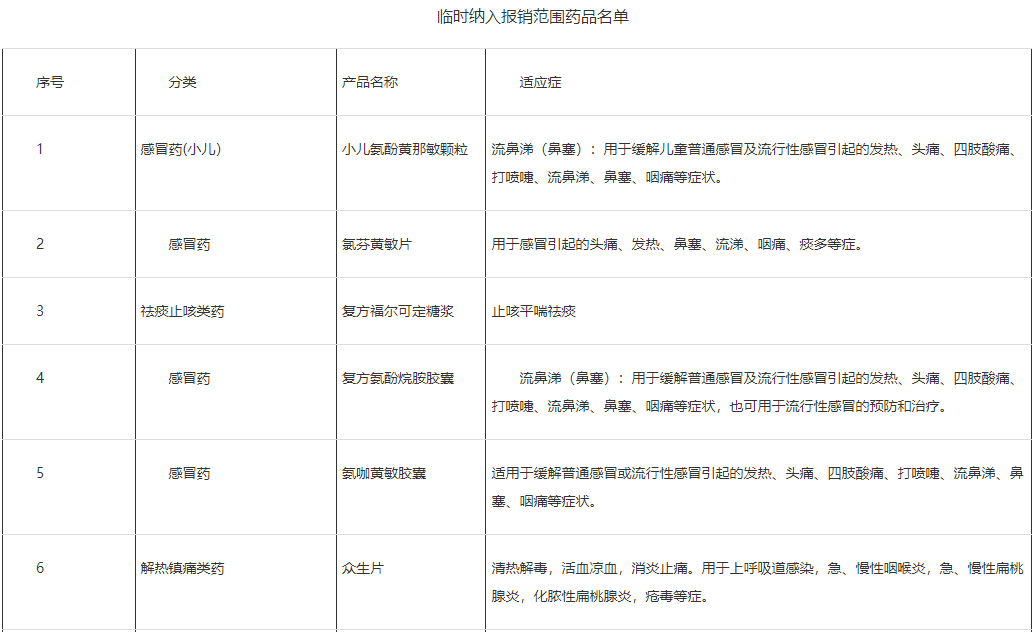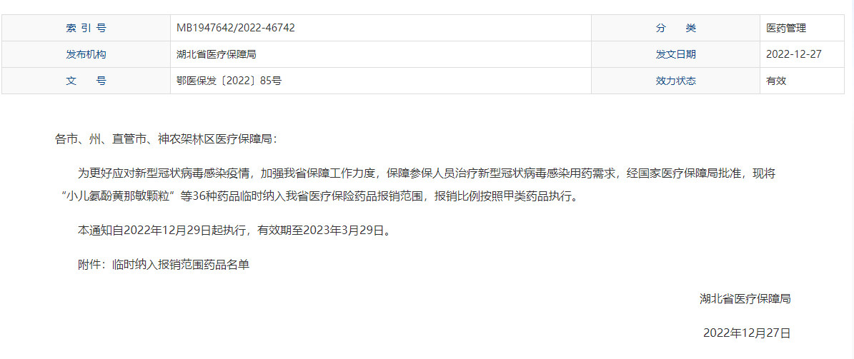 为更好应对新型冠状病毒感染疫情,加强湖北省保障工作力度,保障参保人员治疗新型冠状病毒感染用药需求,经国家医疗保障局批准,现将“小儿氨酚黄那敏颗粒”等36种药品临时纳入我省医疗保险药品报销范围,报销比例按照甲类药品执行。