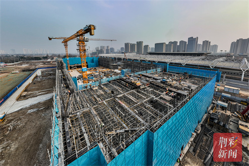 1月2日,在新建荆荆铁路北站房施工现场,站房西侧的工人们各司其职,进行绑扎钢筋、安装模板,两座塔吊一刻不停的运转,一派繁忙景象。