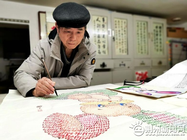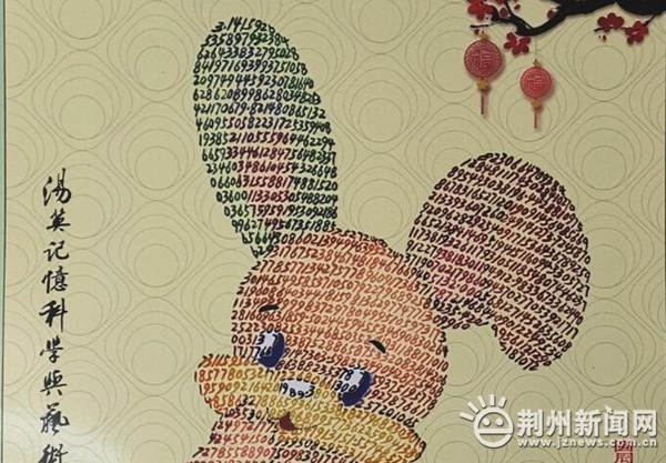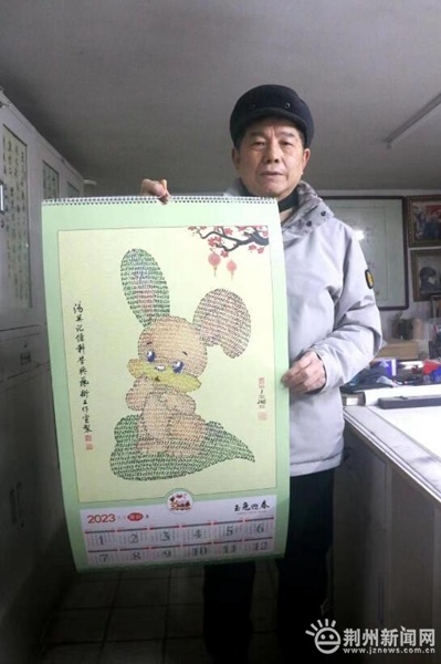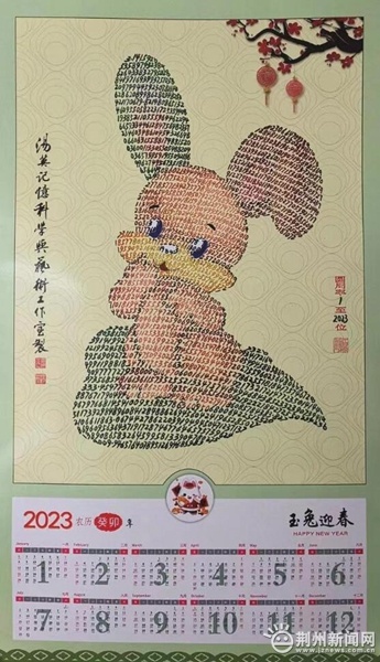 荆州新闻网消息(记者王默)2023年农历癸卯新年前夕,世界记忆奇人、圆周率构成艺术创始人汤英先生,在湖北荆州再次创作出圆周率书画生肖新年挂历——《玉兔迎春》,这是他连续第七年创作这种独树一帜、神奇新颖的新年挂历。汤英向记者介绍《玉兔迎春》挂历的寓意:在全国人民共同抗疫的情形下,用圆周率小数点后的2023个数字描画而成的机敏玉兔,跳跃在一片绿叶上,春回大地,“数字玉兔”带着对生命、对未来的憧憬,这是一种向上的力量,展示迎接春天的生命活力。