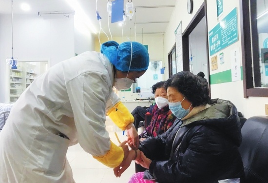 1月3日,在沙市区金龙路社区卫生服务站,医护人员为患者提供医疗服务。