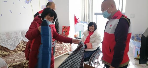 启动仪式后,市红十字会志愿者们兵分多路走访慰问困难群众,送去“博爱家庭包”。市红十字会副会长邹敏和3名志愿者来到碧桂园社区楚荣首府,在困难户杨俊芝家中和她亲切交谈、嘘寒问暖。51岁的杨俊芝多年前肢体残疾,生活困难,行动不便。当收到装有棉衣、棉被、毛毯、大米、糖果等生活用品的“博爱家庭包”后,杨俊芝感激地说道,“红十字这份爱心让我感到非常温暖和甜蜜,今后我要更好地努力生活,一起传递红十字爱心。”邹敏副会长鼓励她勇敢面对暂时的困难,乐观面对生活,相信党和政府及社会爱心力量帮助定会渡过难关。